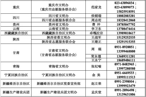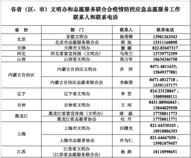 一、带头加强防护始终把安全放在首位,遵守各地各有关部门关于疫情防控的规定,切实做好岗前培训,做到培训不合格不上岗、防护措施不到位不上岗。自觉按照科学指引做好个人和身边亲友的防护工作,戴口罩、勤洗手、常通风、拒野味、不串门、不聚会。二、依法有序参与关心疫情防控的态势和信息,关注各地志愿服务信息系统,根据抗疫斗争的实际需求,在各地应对疫情工作领导小组的统一指挥调度下,时刻做好思想准备、工作准备、组织准备,立足本地,结合所长,主动报名,等候召唤。三、帮助宣传普及参与城乡社区疫情防控知识宣传普及工作,向周边群众做好政策措施解读,做好网络舆情引导工作,不造谣、不信谣、不传谣,不在网络、朋友圈、微信群随意发布未经证实的虚假消息,主动参与辟谣工作,举报不实信息。四、助力排查治理协助有关职能部门和居委会、村委会等基层组织,做好疫情信息的收集、报告、人员隔离、秩序维护及公共卫生措施的实施工作。主动关心近邻,及时化解矛盾,倡导互相帮助,稳定社会情绪。维护环境卫生,有条件的志愿服务组织可以协助做好废旧口罩回收和重点场所消毒,清除病媒孳生地。五、做好医疗保障根据需要,为一线奋战的医生护士提供力所能及的生活保障和交通服务,为医疗机构提供人群疏导、物资运送服务,为相关医疗用品生产企业提供产品包装、发货等外围服务工作。六、提供专业服务鼓励有医学、心理、应急救援等专业技能的志愿者,在相关专业机构的统筹调配下,积极参与卫生防疫、心理服务、救助救护等志愿服务,做好疫情防控辅助工作。生命重于泰山,疫情就是命令,防控就是责任。希望全国各地志愿者、志愿服务组织在确保安全的前提下,团结凝聚起来,统一行动听指挥,科学专业做服务,为坚决遏制疫情传播扩散,夺取疫情防控斗争胜利贡献更大力量。同时,希望社会各界能够理解和支持志愿者、志愿服务组织的爱心善意。我们相信,在党中央的坚强领导下,在人民群众的共同奋斗下,疫情防控阻击战一定胜利!附:各省(区、市)文明办、志愿服务联合会疫情防控应急志愿服务工作联系人和联系电话