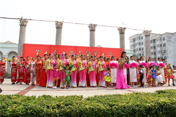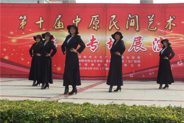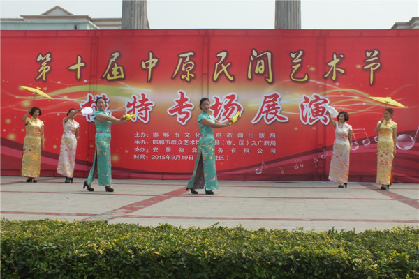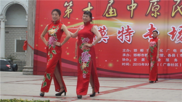 九月二十日上午,第十届中原民间艺术节模特专场在广泰社区举行,来自全市模特行业协会的会员单位及其他模特17个团队350人参加了展示。邯郸市文广新局副局长武鸿雁、市群艺馆馆长马永林、副馆长赵双以及模特协会的各位会长李国才、游生军、路国华、赵森、钟俊华和五位副秘书长等出席并观看演出。社区居民和来自四面八方的群众也早早赶来,现场气氛热烈。