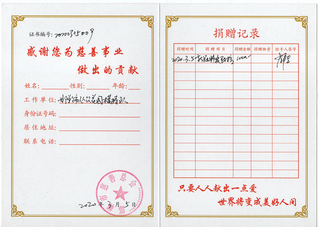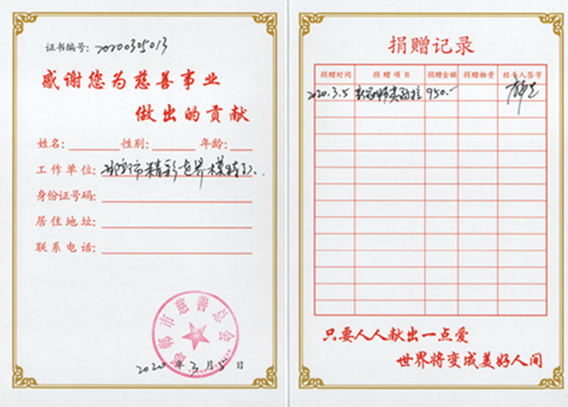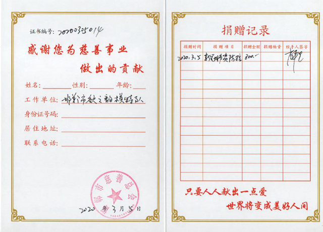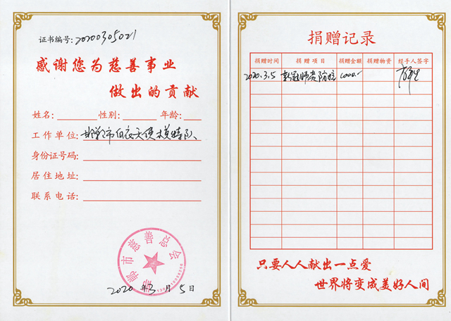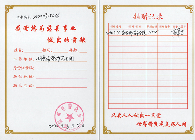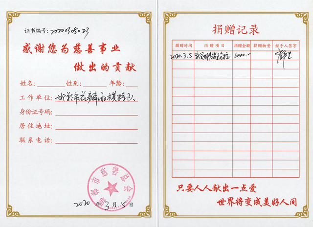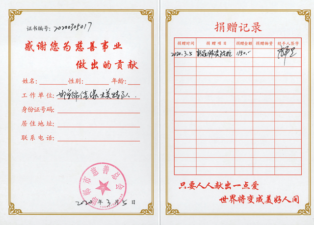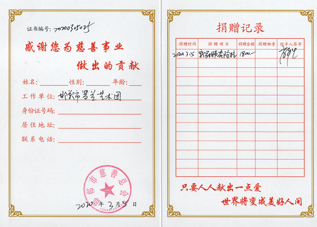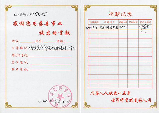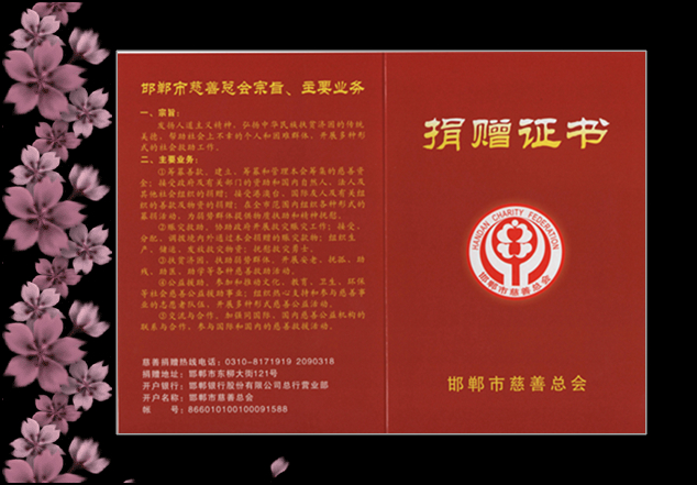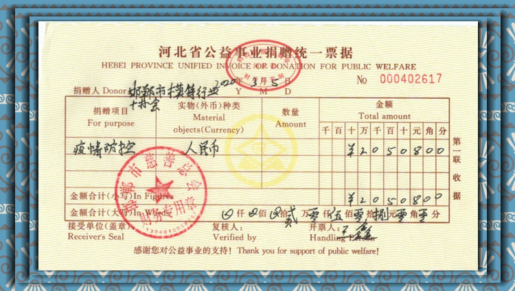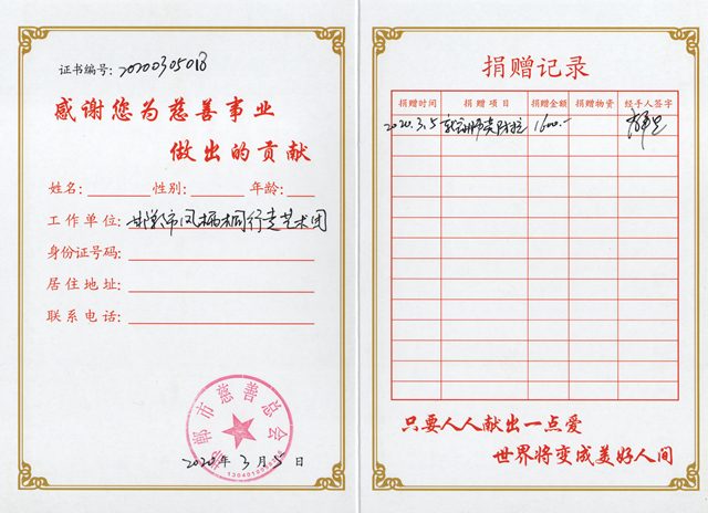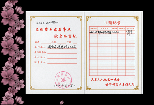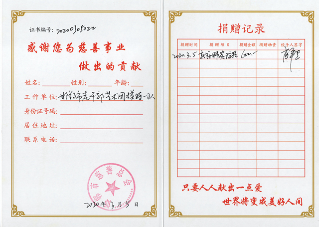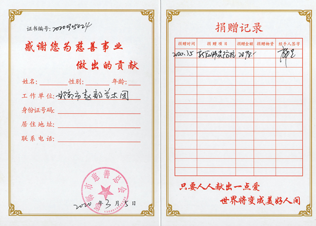 共捐款:20508元,由协会国爱杰、鲍永宏于3月5日上午送到邯郸市慈善总会。