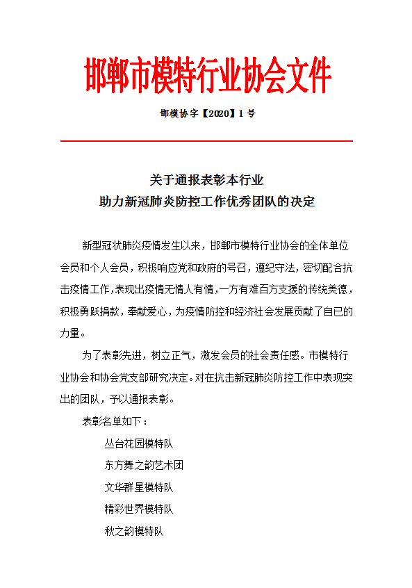关于通报表彰本行业 助力新冠肺炎防控工作优秀团队的决定
