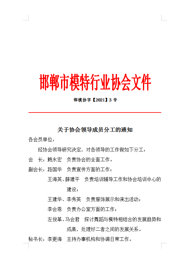 关于协会领导成员分工的通知